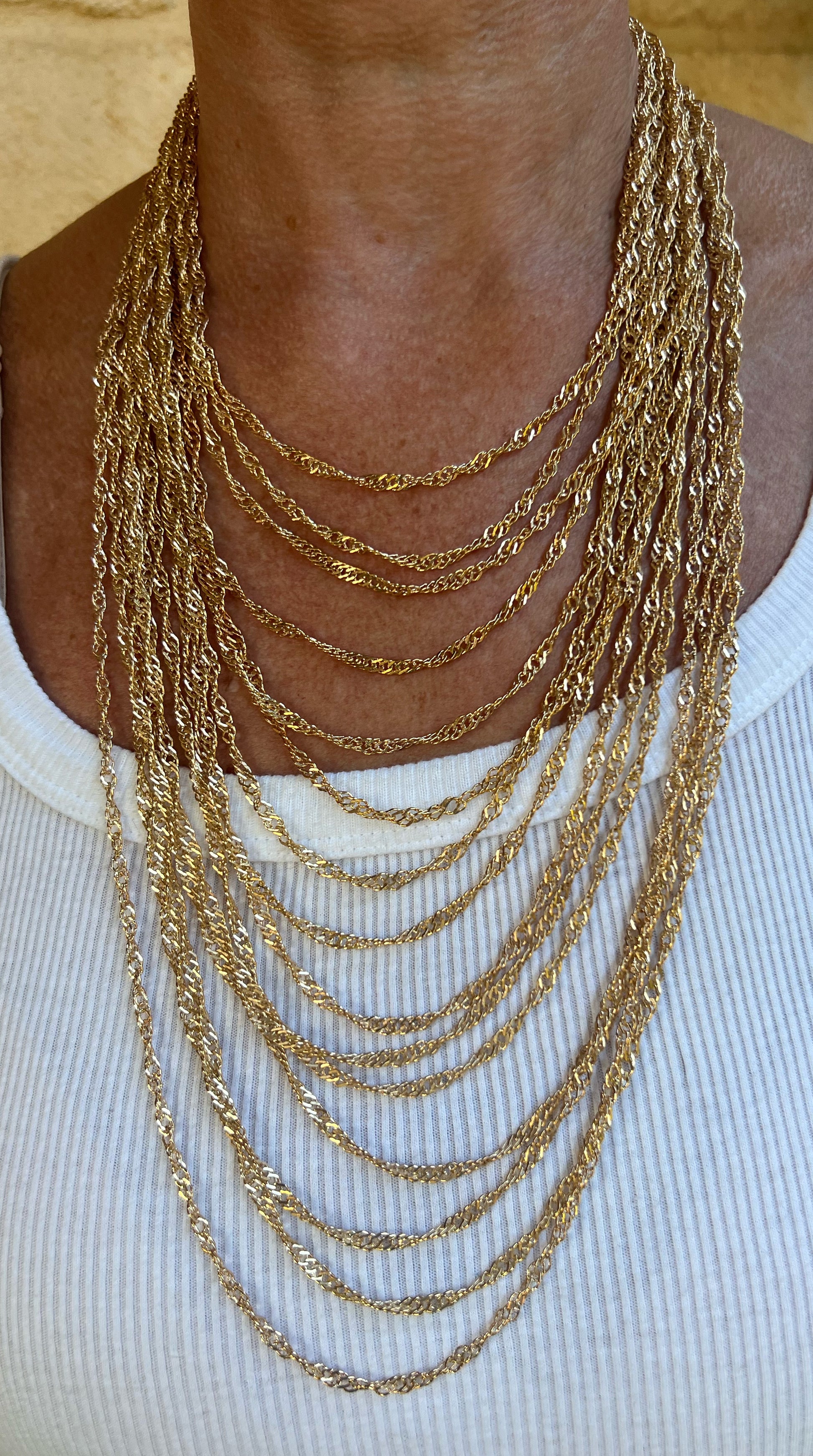 MULTI-FILÈ GOLD è composta da tantissimi fili sottili in catena dorata che, intrecciandosi tra loro, creano un effetto scenografico e luminoso capace di trasformare anche il look più semplice in qualcosa di speciale. Leggerissima da indossare, ma con una presenza che non passa inosservata, questa collana è il perfetto equilibrio tra eleganza e carattere.